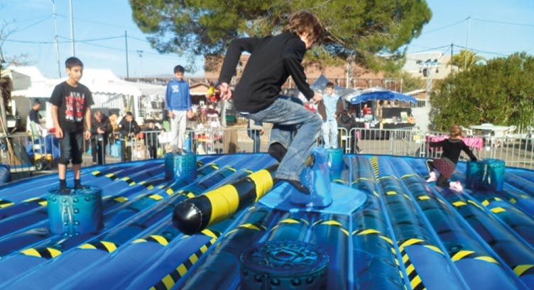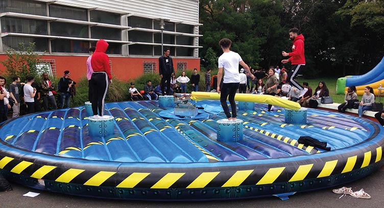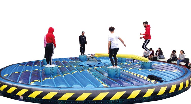 6 joueurs tentent d’esquiver la balayette électromécanique en sautant sur leur plot à chacun de ses passages : en avant, puis en arrière, à vitesse lente puis rapide…